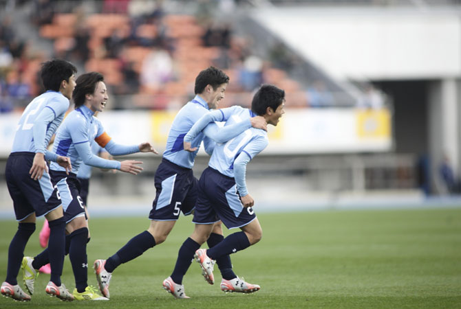 試合終盤は相手の猛攻にあったが、体を張った守備でゴールを許さず、明秀日立が2-1で名門四日市中央工業を撃破した。
