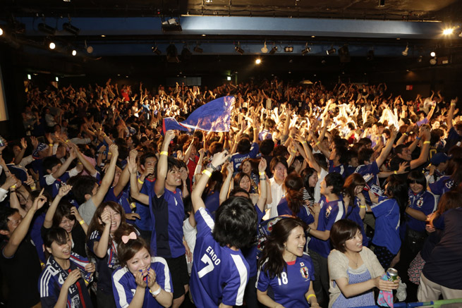 総勢約2000人が集ったこのイベント。各会場でキリンビールの“サッカー日本代表応援缶”を手にしたサポーターが大きな声援を送り、新橋会場では元日本代表MFの岩本輝雄氏が解説をしながらサポーターとともに熱戦を見守った。
