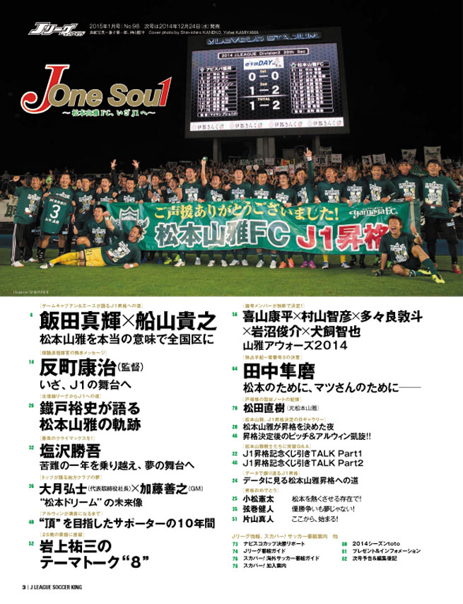 11月22日発売のJリーグサッカーキング2015年1月号は、J1昇格を果たした松本山雅FCを大特集! J2参入3年目での悲願達成の舞台裏に迫ります。