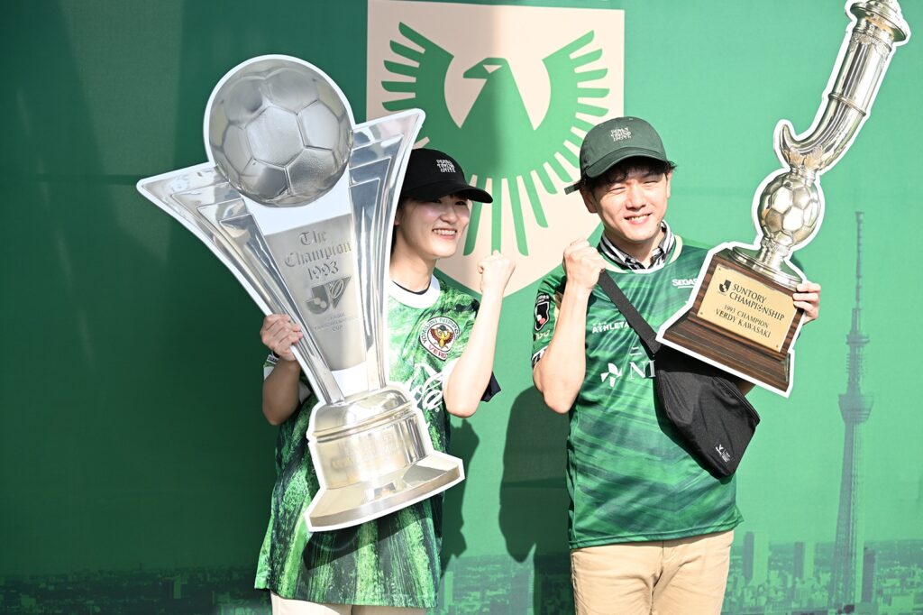 ヴェルディのユニフォーム姿でトロフィーを眺めていたカップルに話を聞くと、彼は「30年来のヴェルディファン」で、隣にいる彼女は1993シーズン当時のユニフォームを着ている。「このイベントに合わせて僕が持ってきたものを彼女に着てもらいました」と話す彼とは対照的に、彼女は「実はサッカーのことはあまり分からない」と明かす。それでも、「過去の歴史とかを教えてもらいながら、彼と楽しみを共有できるのでうれしいです」と笑顔で見せた。