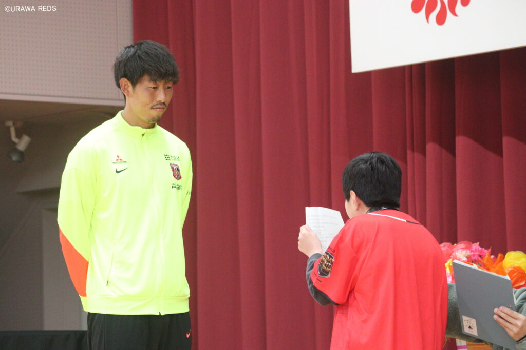 まさに浦和レッズの熱気を間近に感じられる場所に建つこの支援学校を、浦和レッズのGK牲川歩見が訪問したのは3月12日。目的はサッカーボールの贈呈だった。式の会場となったのは体育館。牲川は、自作の応援グッズを身に着けた児童たちに大きな拍手と声援で盛大に迎えられた。