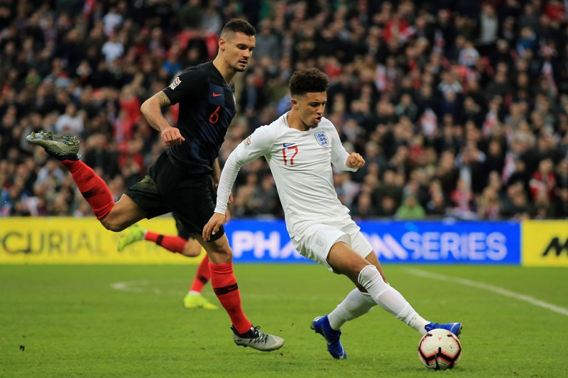 デビュー戦はUEFAネーションズリーグのクロアチア戦だった。この試合は、3年前のクロアチアサポーターの不祥事によるペナルティとして無観客で行われた。78分、ラヒーム・スターリングに代わって出場したサンチョは「あまりに静かだった」と振り返る。