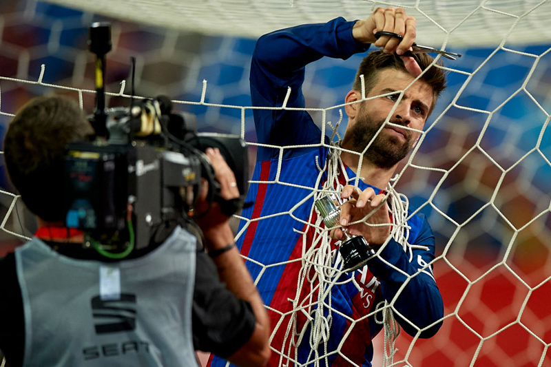 国王杯を制した後、ビセンテ・カルデロンのゴールネットを切り取ったピケ [写真]=Fotopress/Getty Images