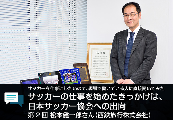 今回、インタビュアーを務めたのは石川幸代(いしかわ・さちよ)さん。男子・女子サッカーの専門学校「JAPANサッカーカレッジ」のサッカービジネス科2年生で、サッカーにかかわる仕事に就きたいという夢を抱いています。サッカー日本代表観戦ツアーを始め、サッカー関連の旅行や遠征を多く手がける西鉄旅行株式会社の松本健一郎(まつもと・けんいちろう)さんに、仕事にまつわるあれこれを聞きました。