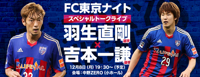 2014シーズンが閉幕した直後の12月8日(月)、FC東京のMF羽生直剛選手とDF吉本一謙選手をお招きしてスペシャルトークライブ『FC東京ナイト(協賛:EURO SPORTS、協力:東京フットボールクラブ株式会社)』を開催いたします!