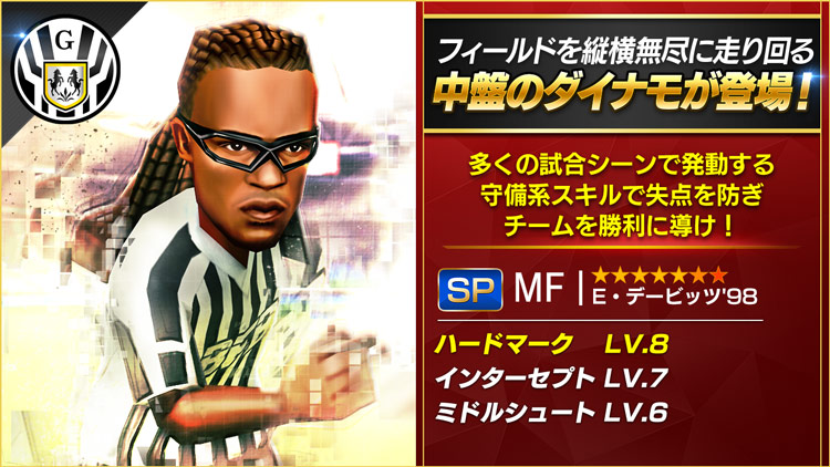 多くの試合シーンで発動する守備系スキルを備えた強力 MF「★7[SP]E・デービッツ’98」選手が各種「プレミアムスカウト」に新たに登場します。この選手が持つLv.8複合スキル「ハードマーク」は、「チャージング」と「チェイシング」の効果を合わせもつ強力なスキルです。
