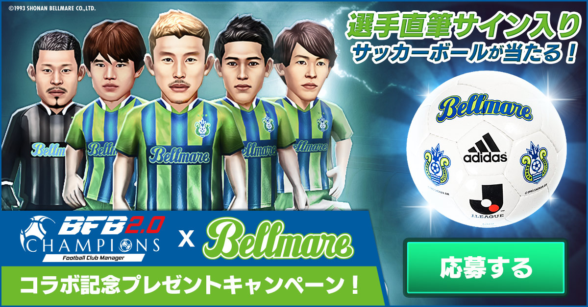 株式会社サイバードがApp StoreおよびGoogle Playにて好評配信中の思考型シミュレーションサッカーゲーム『BFB チャンピオンズ 2.0~ Football Club Manager~』(以下、『BFBチャンピオンズ 2.0』)にて、明治安田生命J2リーグ所属のサッカークラブ「湘南ベルマーレ」とのコラボキャンペーンの一環として、ゲーム内に登場する5選手のサイン入りボールが当たるTwitterキャンペーンや、湘南ベルマーレの試合結果に応じてゲーム内アイテムをプレゼントする応援キャンペーンを実施する。