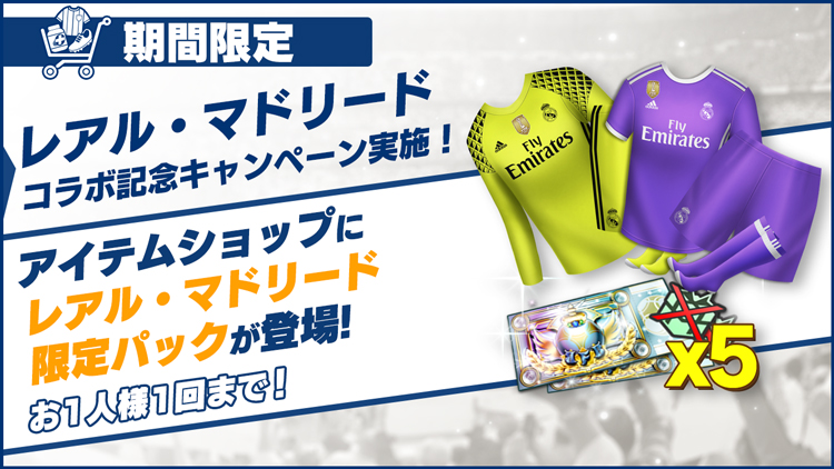 期間中、ゲーム内「ショップ」にて、レアル・マドリードのAwayユニフォームと「マイプレミアムスカウトチケット」がセットになったお得な「レアル・マドリードコラボ記念パック」を、お一人1回限定で、10BFBコインで販売します。