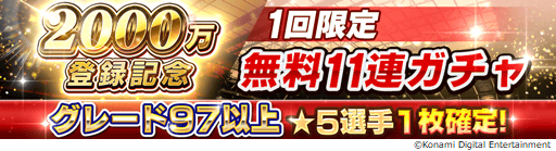 グレード97以上の★5選手カードが1枚確定で獲得できる無料11連ガチャです。