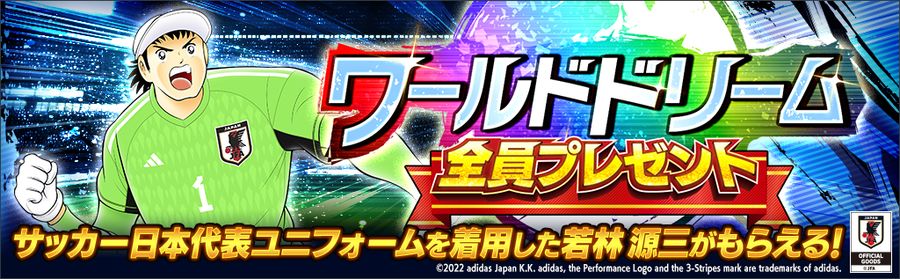 KLab株式会社が提供するスマートフォン向け対戦型サッカーシミュレーションゲーム『キャプテン翼 ~たたかえドリームチーム~』において、11月4日から12月2日にかけ、サッカー日本代表公式ユニフォームを着用したSSR若林源三などが登場する「ワールドドリームキャンペーン」を実施すると発表した。