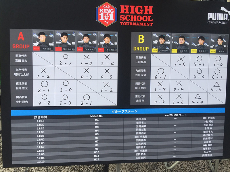 『KING of 1v1』は、縦15メートル、横8メートルの特設コートで1試合2分間、一対一で勝負してより多くの得点を挙げた選手が勝者となるルール。決勝大会当日、埼玉スタジアム2002の特設コートには、東北、関東、関西、九州で行われた予選大会を勝ち抜いた8名が集まり、4名ずつ2組に分かれてグループリーグが行われた。