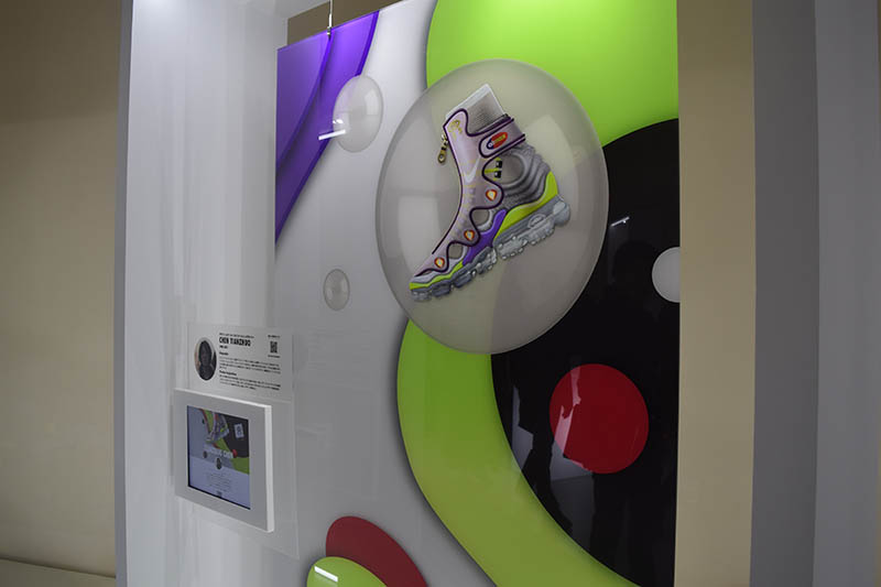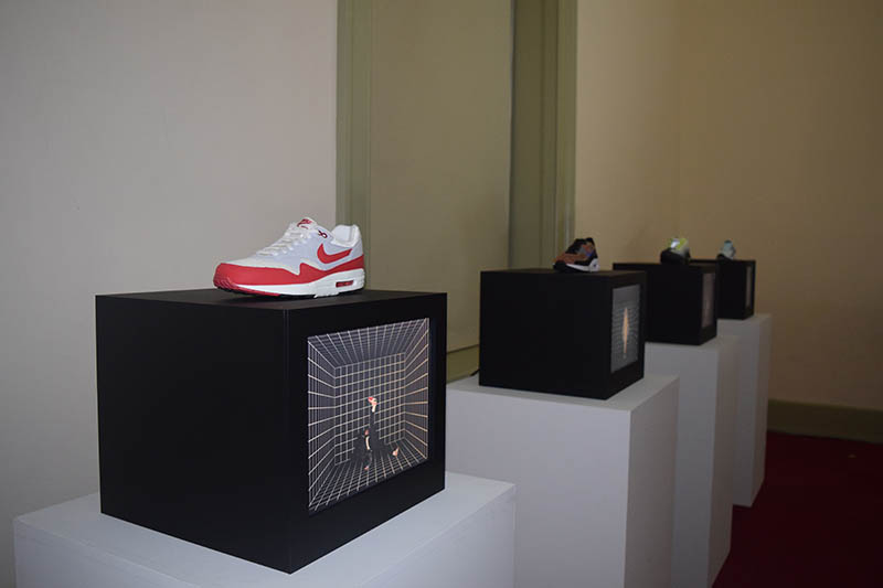 「エア マックス」にインスパイアされたサッカースパイク「レボリューションパック」も展示(右下)