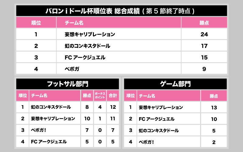 第5節終了時点、「フットサル部門」と「ゲーム部門」を制して6ptを積み上げた妄キャリが1位をキープ。続く虹コンが17ptで2位と追い上げ、FCアークジュエルが16ptで3位、ベボガ!が9ptで続いている。妄キャリがトップ独走しているがファイナルイベントでのアイドルの熱戦に期待しよう!