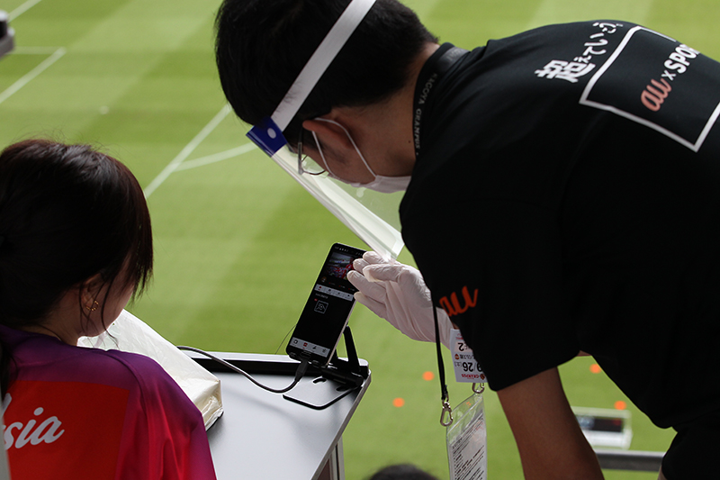 au 5Gエリア化された豊田スタジアムのメインスタンドで、5G端末による未来のスタジアム観戦を先取りできる「au 5G体感シート」を事前に販売。本来は2月に予定されていたが、新型コロナウイルス感染症の影響で7カ月も延期となった。担当者の谷藤宰さんは「お客さまに安心・安全にサービスを体験してもらうために、オペレーションのあり方やサービス内容を何度も検討いたしました。加えて、これは業界初の取り組みとなります。前例を参考にしたくてもできない中、お客さまが満足する内容を提供できるかという点に関して難しさを感じました」と述べ、設置の目的について次のように語る。