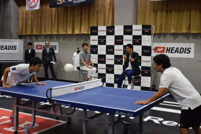 ゲストして登場した鈴木大輔選手も見守るなか、デモプレーが開始。Mもこの後行われるメディア対抗戦のため、選手たちをじっくり観察した。どうやら台に両手をつけることが大事そうだ。すると突然選手が卓球台へダイブ! アクロバティックなプレーに会場も興奮に包まれた。