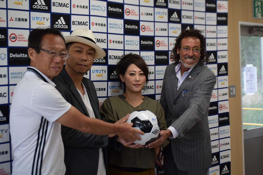会見での岡田オーナー、USAさん、友近さん、ラモスアドバイザー