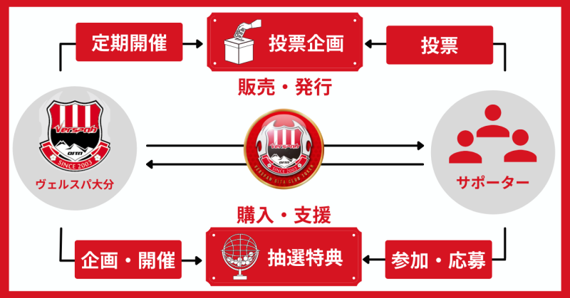 ヴェルスパ大分のトークンは“ヴェルスパトークン”としてFiNANCiE上で発行されます。トークンを購入いただいた方々は、運営の一部に携われる投票企画への参加や特典抽選などへ応募いただくことができます。