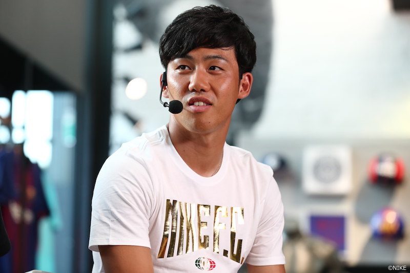 『ティエンポ レジェンド 7』の先行販売ライブショーに出演した遠藤。スパイクの魅力を語った [写真]=NIKE