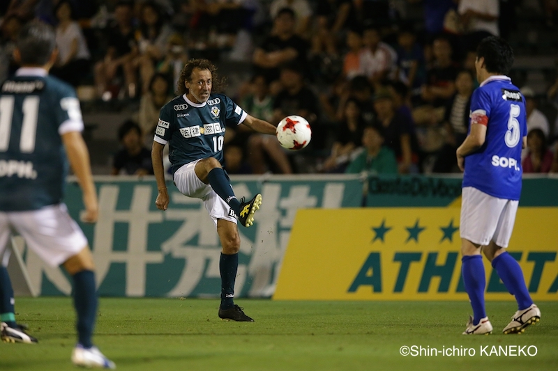 1−1で迎えた26分には、J LEGENDSがゴールのほぼ正面でFKを得る。永井が蹴るかと思いきや、永井は背番号10の背中をポンと推す。キッカーを担当したのは澤登正朗。右足を一閃すると、蹴り出されたボールはきれいな弧を描いてゴールに吸い込まれた。