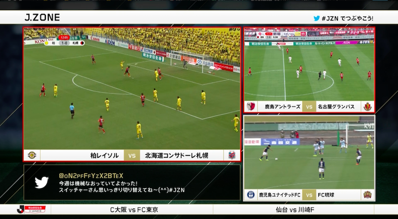 J.ZONEは同時に行われているJリーグの複数試合を一気に楽しめる新感覚番組で、迫力のゴールはもちろんのこと、チャンスシーンや問題の場面など各スタジアムで同時多発する出来事をザッピング。また「居酒屋」的なゆったりトークを大切にしており、解説者も普段の中継とは一味違った一面を見せてくれる。