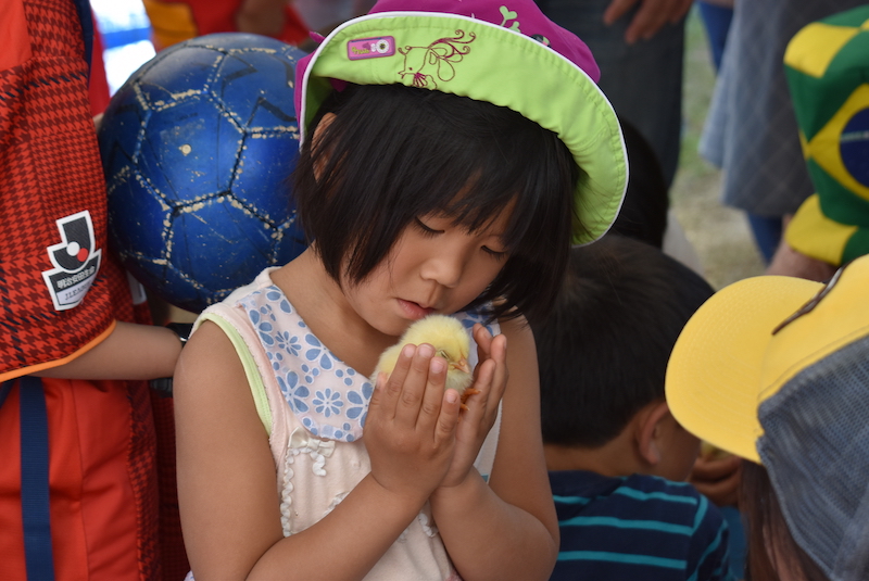 まずはひときわ盛況を博していた「もふもふ動物ランド」に足を運ぶことにした。ケージで囲まれた動物ランドには、ひよこやモルモット、羊やアルパカが大集合。参加者は抱きかかえたり、恐る恐る触ってみたり、思い思いの方法で触れ合っていた。可愛いもふもふ動物たちの中でも特に異彩を放っていたのがアルパカだ。多くの子どもたちに囲まれても、触られても、泰然自若としている。グランパスサポーターはもちろん、はるばる横浜からやってきたマリノスサポーターも「超かわいい!」と大興奮の様子だった。