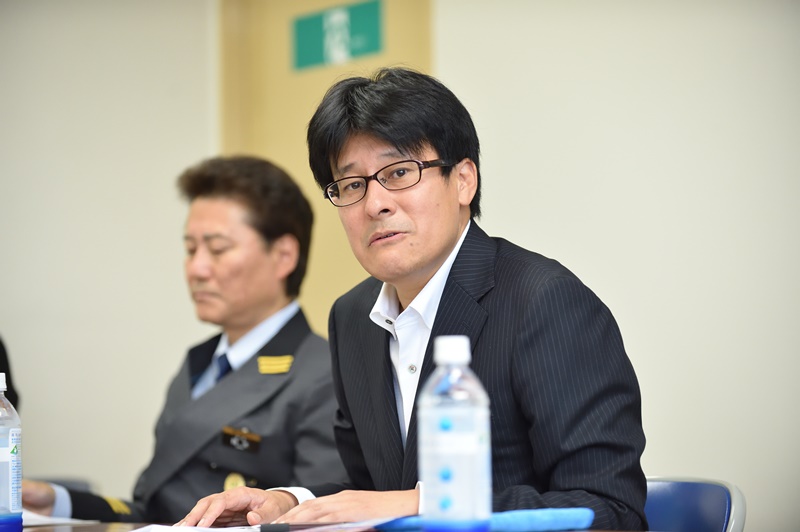 鈴木管区長からは町田管区や小田急線町田駅についての説明と駅長業務の説明をしていただきました。駅員の人数も町田駅は新宿駅に次ぐ規模だそうで、町田駅は1日に約30万人の方が乗降しているそうです。「町田駅は横浜線もありますし、駅前のデパートもありお買い物のお客様も多く利用していただいている駅です。今日はその町田駅で相馬監督に手を上げてロマンスカーの出発の合図を出していただきます」と鈴木管区長。相馬監督は小田急線の中でも非常に大きな駅で1日駅長をさせていただきました。