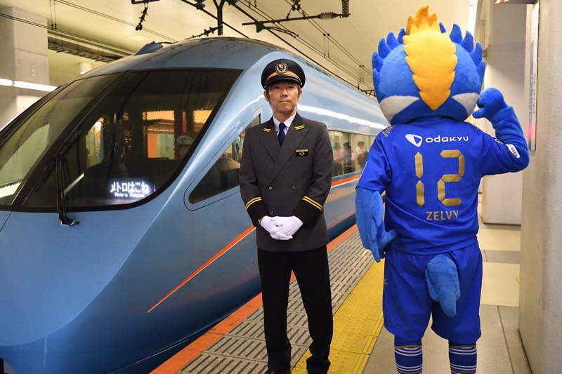 会見後、相馬監督は1日駅長の業務として、マスコットのゼルビーと共に15時53分町田駅発のゼルビアカラーの『ロマンスカー・MSE(60000形)メトロはこね22号』の出発の合図を行い、1日駅長として業務を終えました。相馬監督は「あらためてこういう機会を作ってくださったことに感謝したいですし、あまりできない経験をさせていただきましてありがとうございます」と感謝の言葉を述べました。この模様は地元メディアを中心に報道していただきますので、皆さんぜひ、お楽しみください!