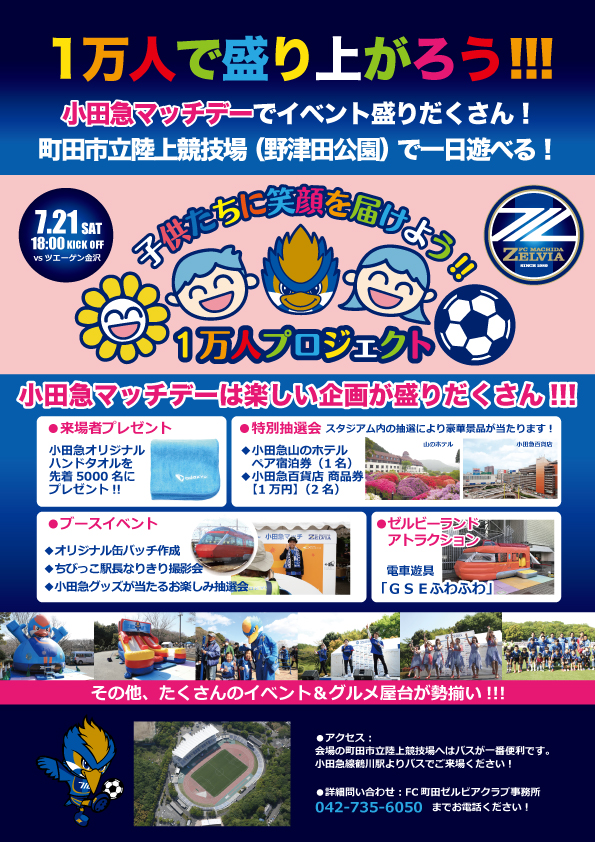 7月21日(土)の『小田急マッチデー』vsツエーゲン金沢では、先着5000名に小田急オリジナルハンドタオルの来場者プレゼント、小田急山のホテルペア宿泊券や小田急百貨店商品券が当たる特別抽選会そしてロマンスカーのふわふわ遊具「GSEふわふわ」などイベントも盛りだくさんとなっております。試合まで1週間ちょっとなりますが、子どもたちに満員のスタジアムという非日常空間を味わってもらい、夏休みの良い思い出になるよう、集客に力を入れていきたいと思います。皆様ぜひ、ご家族・ご友人をお誘いの上、町田市立陸上競技場にお越しください!