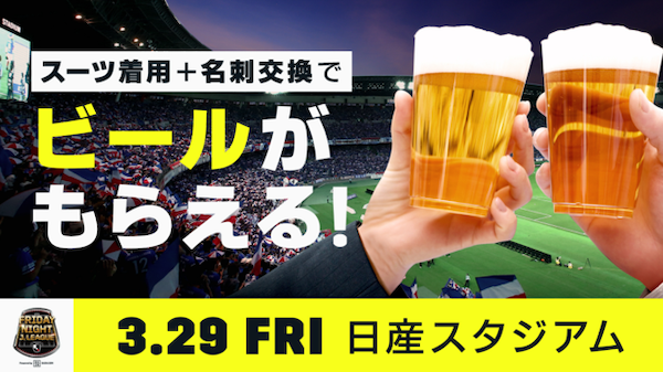 プレミアムフライデーにちなみ、サントリーのプレミアムモルツとのコラボ企画を実施します。日産スタジアムのトリコロールランドに設置された特設ブースにスーツで来場したお客様が名刺を渡すと、生ビール1杯がプレゼントされます。