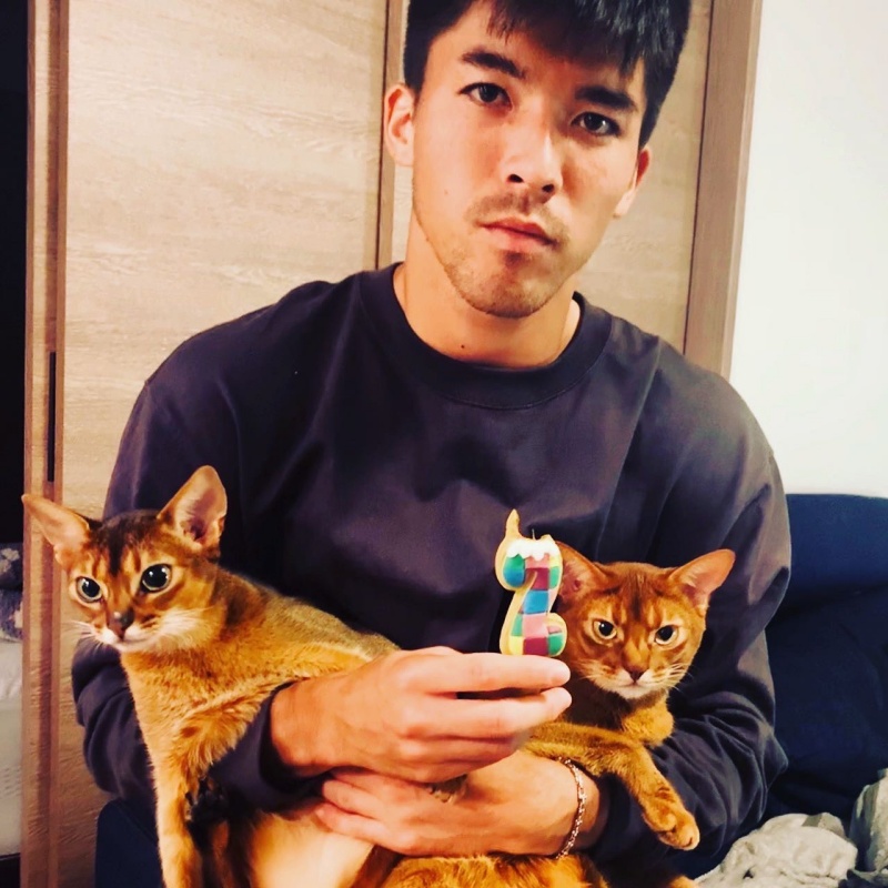 愛猫のロべ(♂)とカルー(♀)です! 名前の由来は、皆さんが想像されている通りだと思います(笑)。アビシニアンは猫の中でも環境の変化に順応しやすい種類だと知り、移籍の多いプロサッカー選手でも飼えるのではないかと思ってこの子たちを迎え入れました。