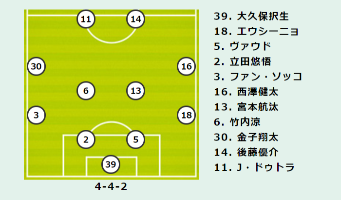 水曜日に行われた前節のベガルタ仙台戦は2-3で敗れたものの、2得点はどちらも良い形だった。1点目はMF西澤健太の持ち味が存分に出た正確なミドルシュートで、その前のパス回しも良かった。2点目は相手の引いた守りをサイドからこじ開け、最後はFWジュニオール・ドゥトラが気迫のヘディングで決めた形。J・ドゥトラは限られた出場時間の中でも好調を維持し、しっかりと結果を出している。