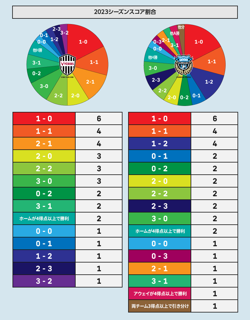 昨季リーグ戦で多かったスコアを見ると、神戸と川崎Fはともに『1-0』の勝利が最多で6試合。神戸が次いで多かったのが『1-1』の引き分けと『2-1』の勝利で4試合ずつ。川崎Fは、『1-1』の引き分けと『1-2』で敗戦が4試合ずつとなっている。