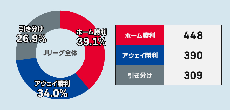 しかし、意外にも大きく差は開いておらず、アウェイチームの勝率は34.0%、引き分けの確率も約4分の1(26.9%)と高い数字を記録している。Jリーグ全体の傾向として言えば、直近の成績や過去の対戦成績を見つつ、積極的にアウェイチームの勝利を予想してみるのも一つの手かもしれない。