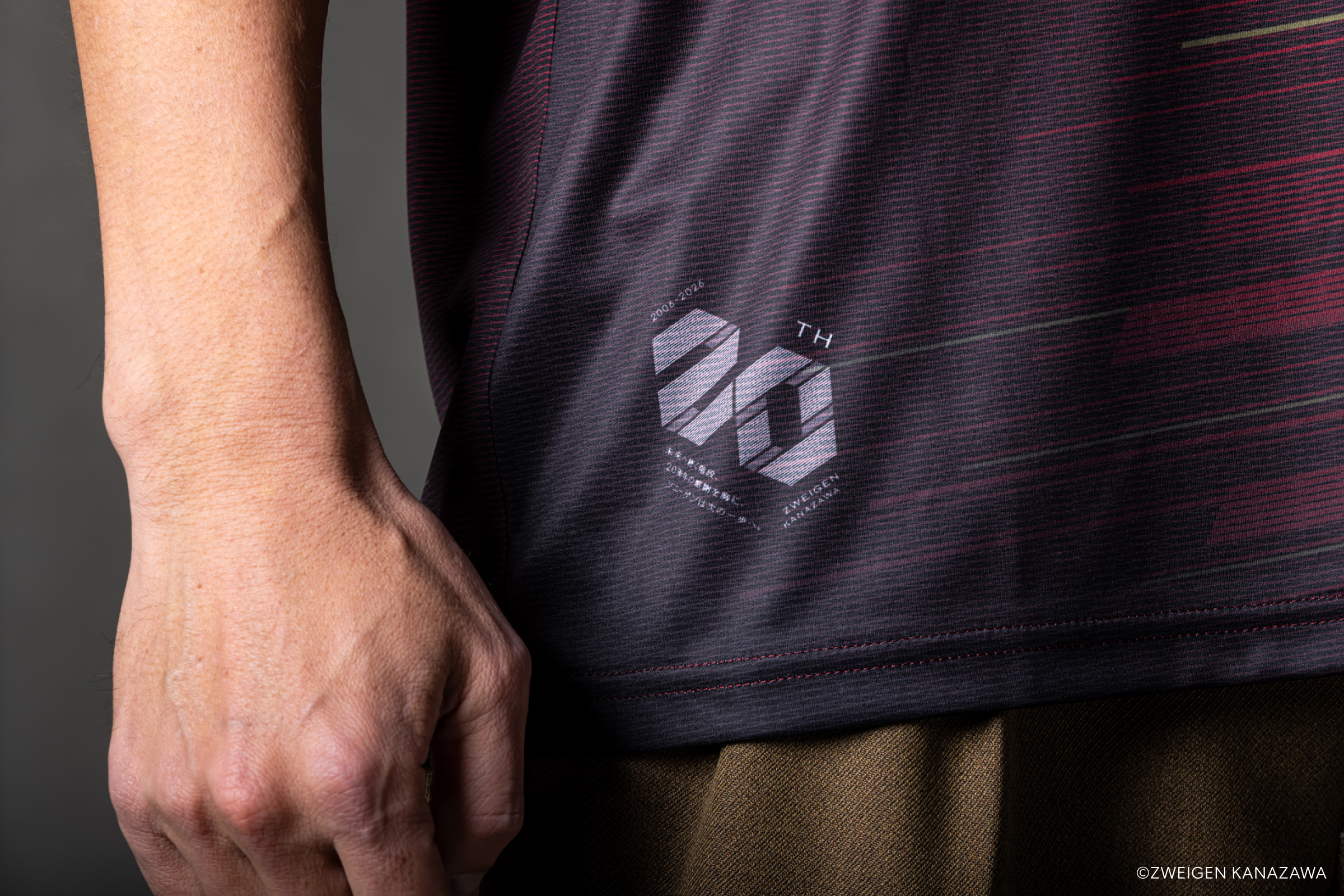さらに右裾には、「未来へ続く階段、20周年の感謝を胸に、ツエーゲンは次の一歩へ」と刻んだ20周年ロゴを配置。左胸にはポリクレストのゴールドエンブレムをアルミ蒸着加工し、高級感を演出しました。