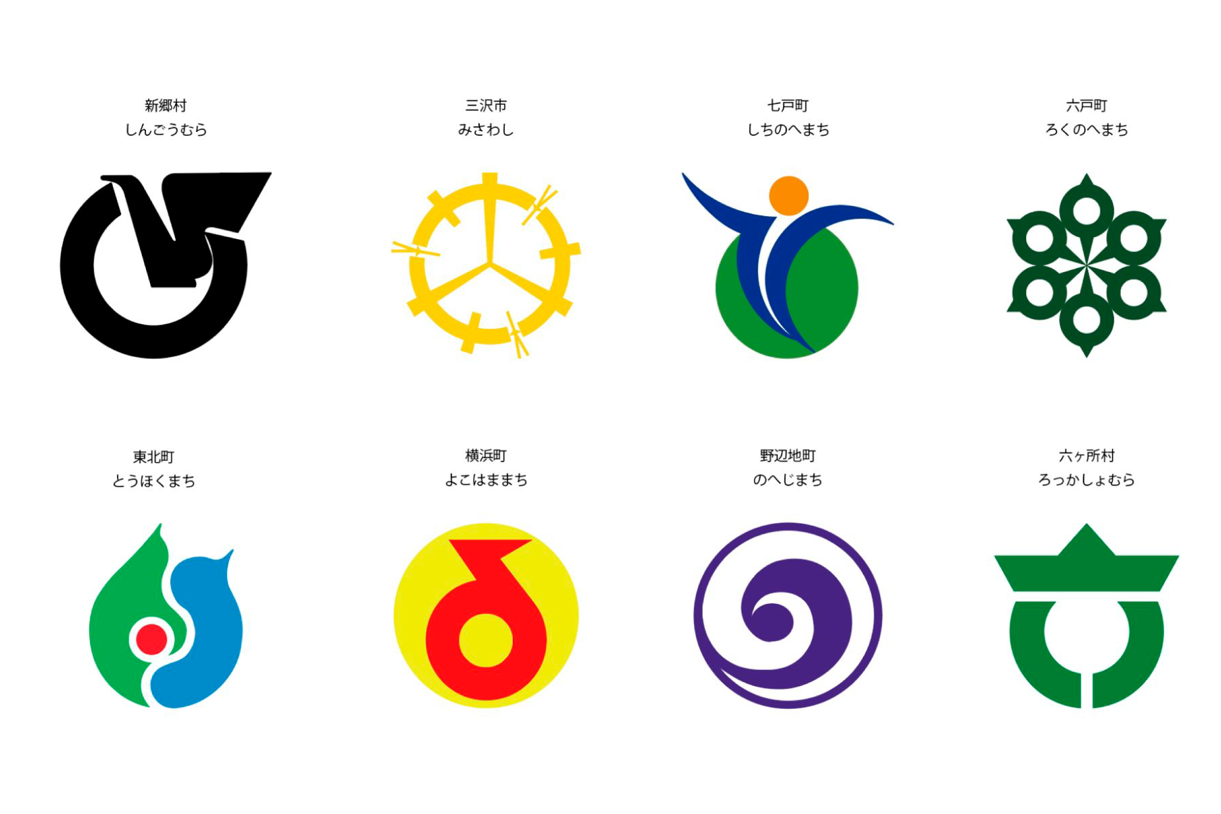 市町村章は、その自治体の風土や歴史、文化などを象徴的に表現したマークです。例えば八戸市は「八戸」の2文字と旧南部藩の「向鶴の紋」が図案化されたもので、こうした16市町村のマークをユニフォームの全面に並べました。
