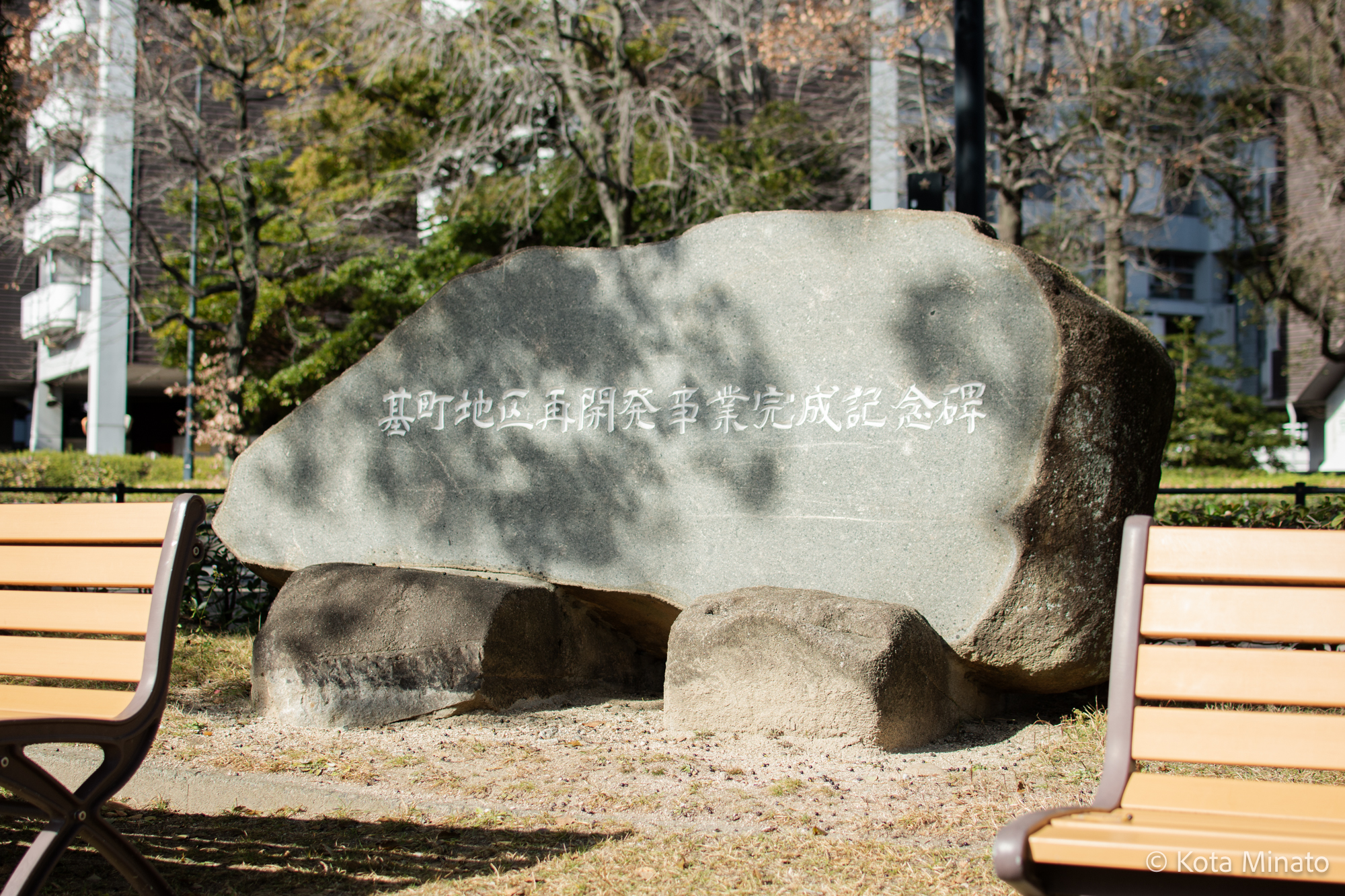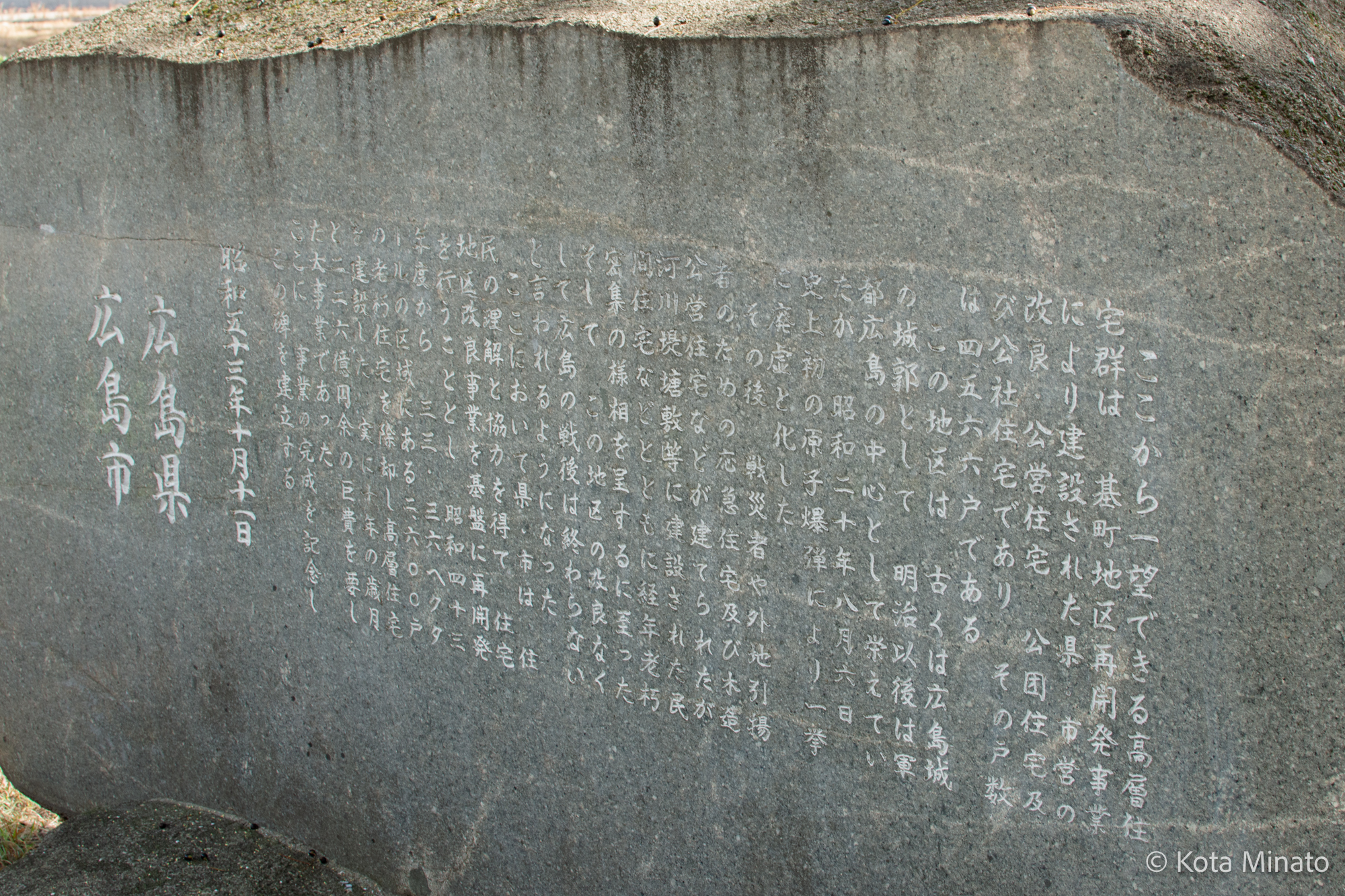 1978年10月11日、基町地区再開発事業完成記念式が行われ、完成した高層住宅群が見渡せる広島城内堀の南側に記念碑が建てられた。記念碑はのちにスタジアム建設を機に移設されて、現在は広島城内堀の北西側にある。碑文には「この地区の改良なくして広島の戦後は終わらない」と刻まれていて、広島の復興において基町が重要な場所であったことを示している。
