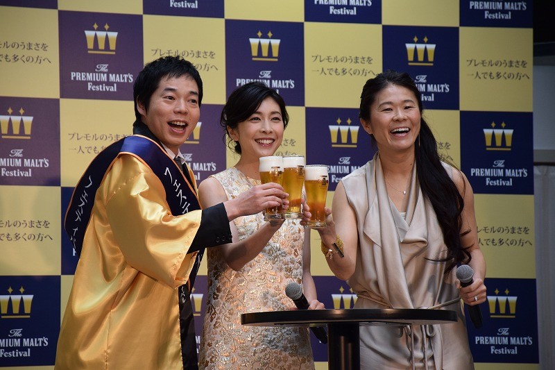 プレミアム・モルツを手に乾杯する今田耕司、竹内結子、澤穂希(左から)