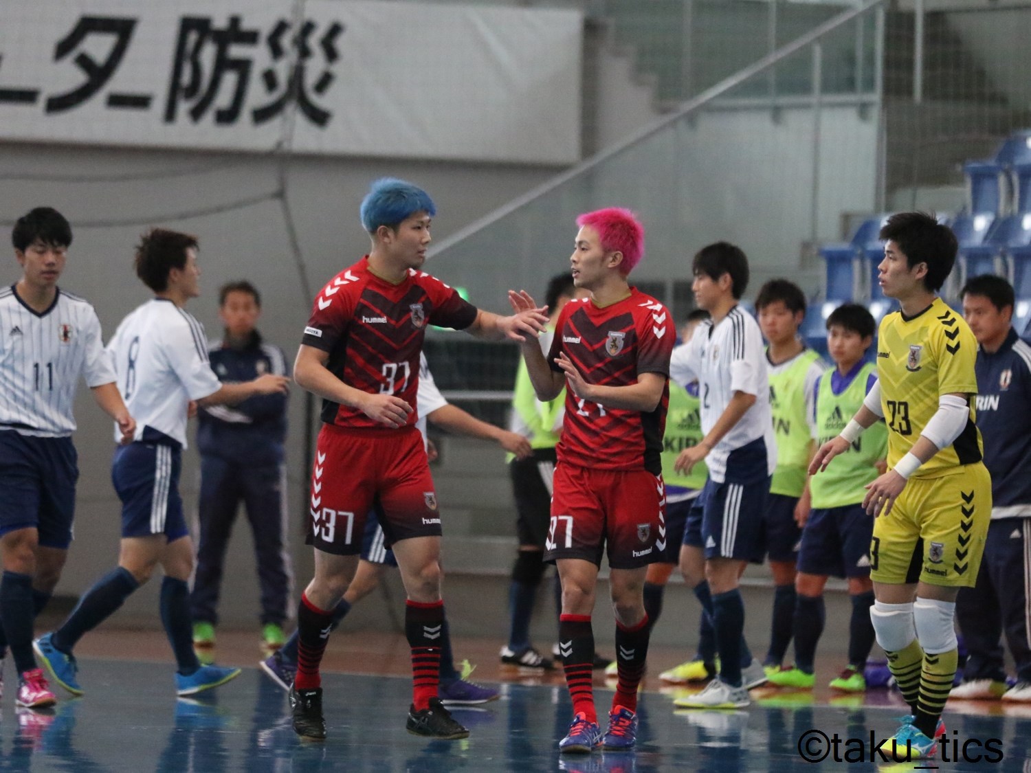 細かくセット交代を行う日本は、前半10分にGKを坂桂輔に交代。名古屋サテライトにチャンスをつくられるが、GK坂のセーブもあり、追加点は与えなかった。迎えた前半19分、日本はFP松岡瑠夢からのキックインを受けた岡田がミドルシュートを決めて1-1に追いつく。このまま前半は1-1で終了した。