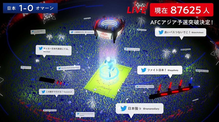 本施策は、「#届けてキリン」を付けて、Twitterで応援メッセージを投稿すると、1つの投稿につき1体の「応援アバター」がバーチャル上のスタジアムに登場し、試合の展開に合わせて、応援アバターたちが感情を表したり、人文字やゴール後のパフォーマンスなど、バーチャルならではの応援をリアルタイムに表現する施策となっています。AFCアジア予選の試合中、このスタジアムの様子はキリンサッカー応援Twitter公式アカウント「#届けてキリン みんなで応援チャレンジ」(@kirin_soccer_nc)からライブ配信されます。