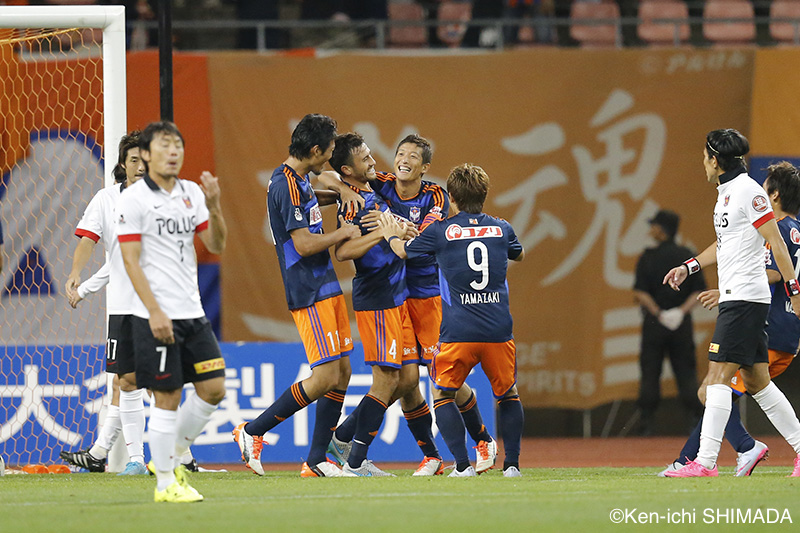 浦和戦で舞行龍ジェームズ(中央右から3人目)の得点を喜ぶ新潟メンバー [写真]=嶋田 健一