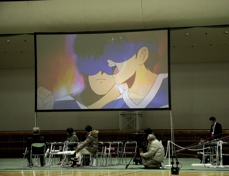 ブラインドサッカーの試合前にはNHK制作の高橋陽一さんによるアニメ映像が流れた