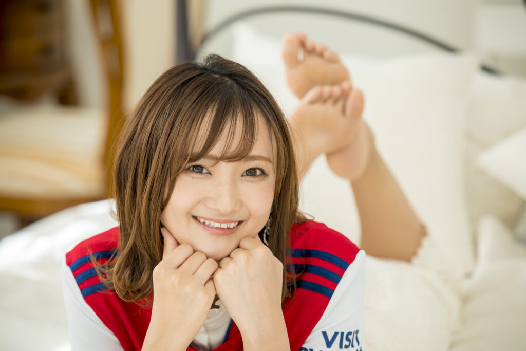 「正直に言うとアーセナルのことは知らなかったんですけど、赤×白×青の組み合わせがかわいくていいですね! 色合いがヴァンフォーレっぽいから、とても楽しく撮影できました(笑)。ヴァンフォーレのユニフォームは何着か持っていて、普段の配信でもよく着ているんですよ」