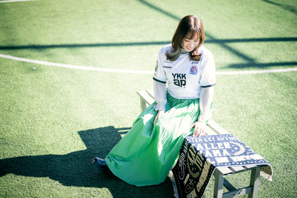 「撮影系のイベントはあまり経験がないので、正直緊張しました。でも楽しかったです! カターレ富山=青のイメージが強かったんですけど、2ndも日常使いできそうな柔らかい色合いで好きですね。ユニフォームのデザインの良さも、他のチームにはない魅力だと思います。今回は大好きな緑色のスカートと合わせてみました。ユニフォームを着るのは学生時代以来なので……大丈夫かどうか、ちょっと不安です(笑)」
