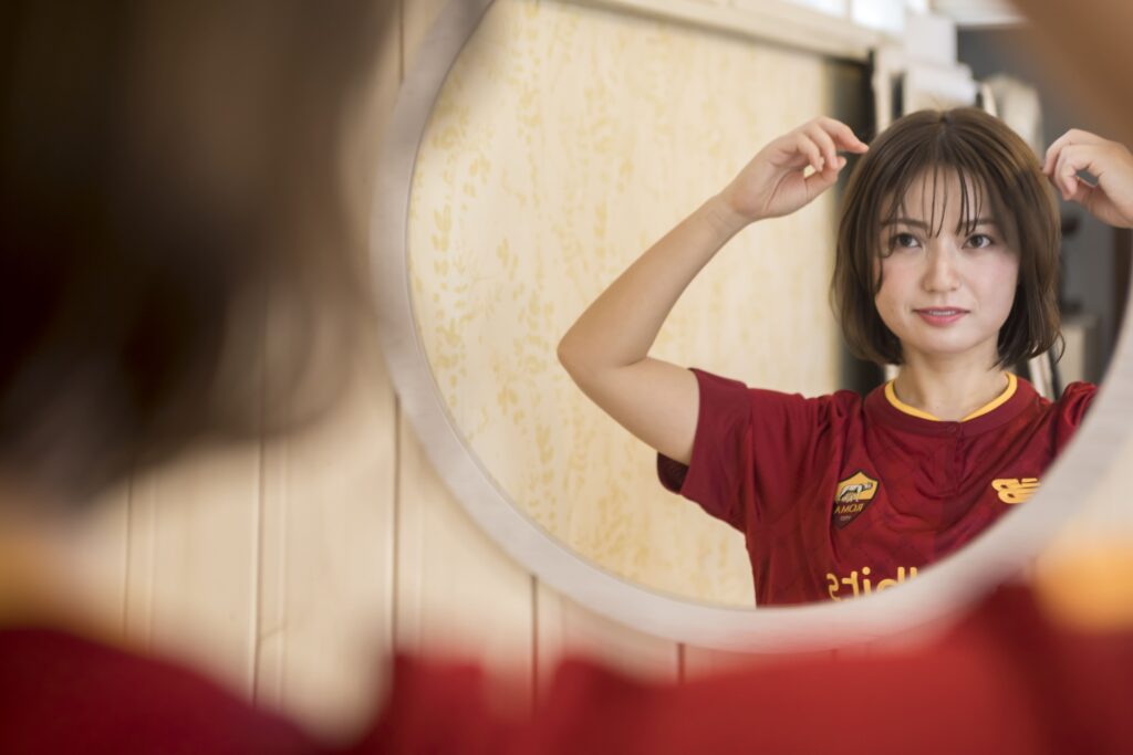 「サッカーのユニフォームは初めて着たのですが、生地が柔らかく着心地も軽いのでとても驚きました! パジャマや部屋着として使うのも良さそうですね。このユニフォームは、他にはない独特のえんじの色味がかわいくてお気に入りです。普段はモノトーンの服ばかり着ているので、たまにはこういうのもありかもって。ニューバランスが好きなので、その点でも私にピッタリだと思いました(笑)」
