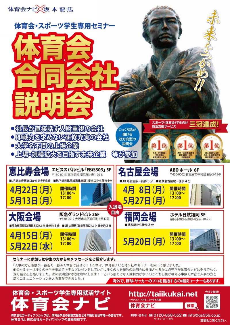 体育会学生の皆さんが学生生活を通して経験してきたことを、そのまま強みとしてアピール出来ますので、クラブの皆様お誘い合わせの上、是非参加してみてはどうだろうか。