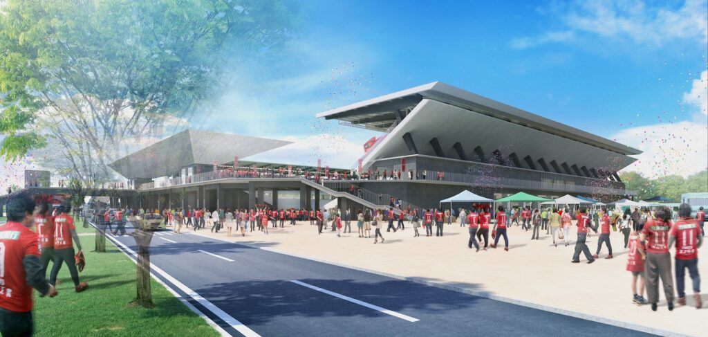 金沢スタジアム(参照:完成イメージ、金沢市提供)は、金沢市磯部町の金沢城北市民運動公園内において金沢市民サッカー場を再整備している施設で、地上4階建て、延べ床面積1万9千平方メートルで、収容人数は約1万人です。来シーズンからJ2・ツエーゲン金沢の本拠地となる予定で、北陸初のJリーグ規格を満たすフットボール専用スタジアムとして来月末に完成後、24年2月ごろの併用開始を目指しています。