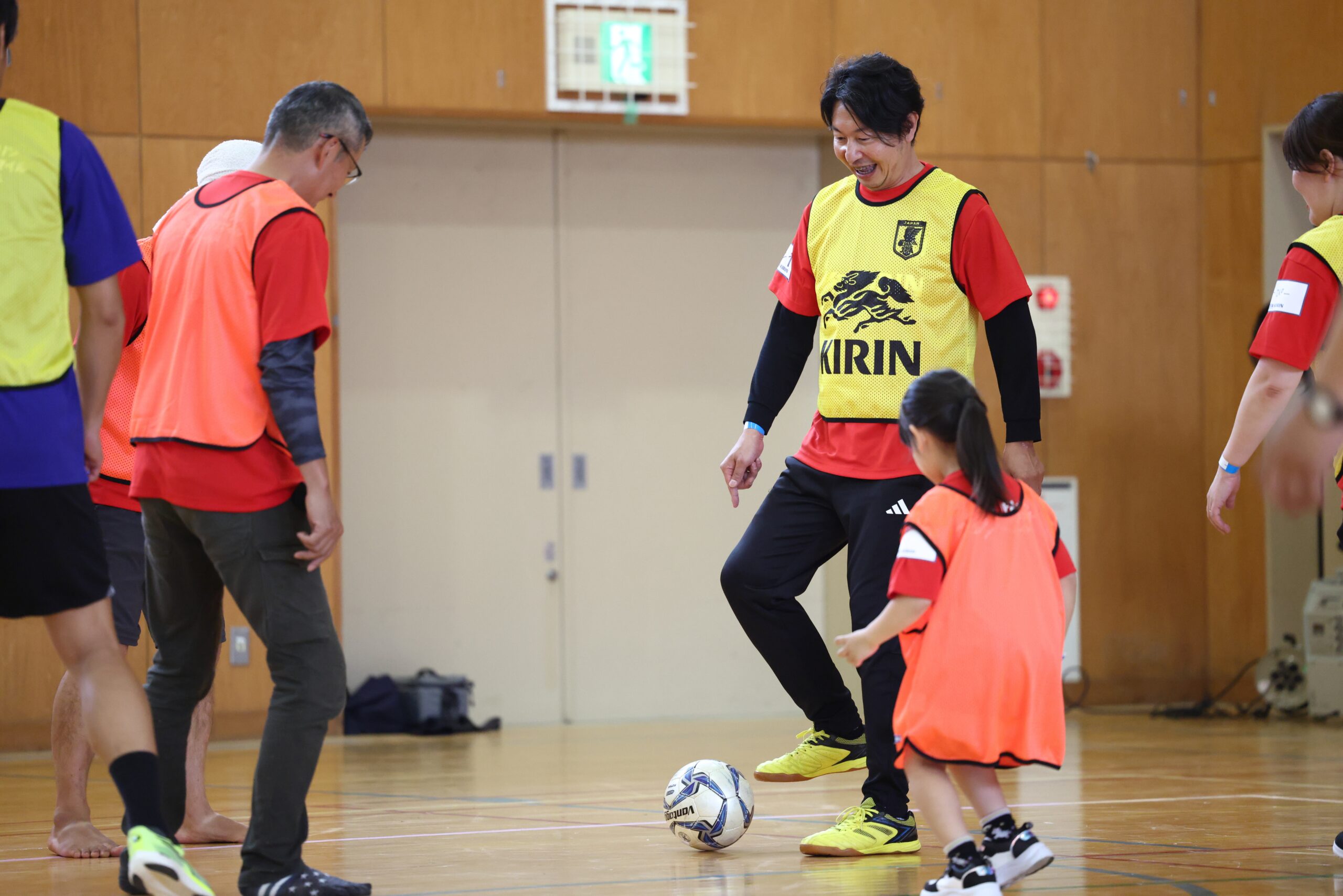 当日は、能登地方で被災された方々や輪島市町野地区を中心に、1歳〜87歳まで老若男女の方々に参加いただきました。開会式ではキリンホールディングスの泉伸也より「今日はご参加いただきありがとうございます。歩いてプレーするサッカーなので、性別や年齢などに関わらず楽しむことができます。ボールをパスすると心の距離も縮まりますので、ぜひたくさんの方と楽しんでください」と挨拶を行いました。ゲストとして元サッカー日本代表 永島昭浩さん、中西永輔さんも登場し、永島さんからは「今日皆さんとサッカーができることを楽しみにしていました。笑顔をたくさん届けたいと思います!」と、中西さんからは「僕自身ウォーキングフットボールが初めてなので、怪我なく、みんなで楽しくウォーキングフットボールをしたいと思います!」とコメントをいただきました。