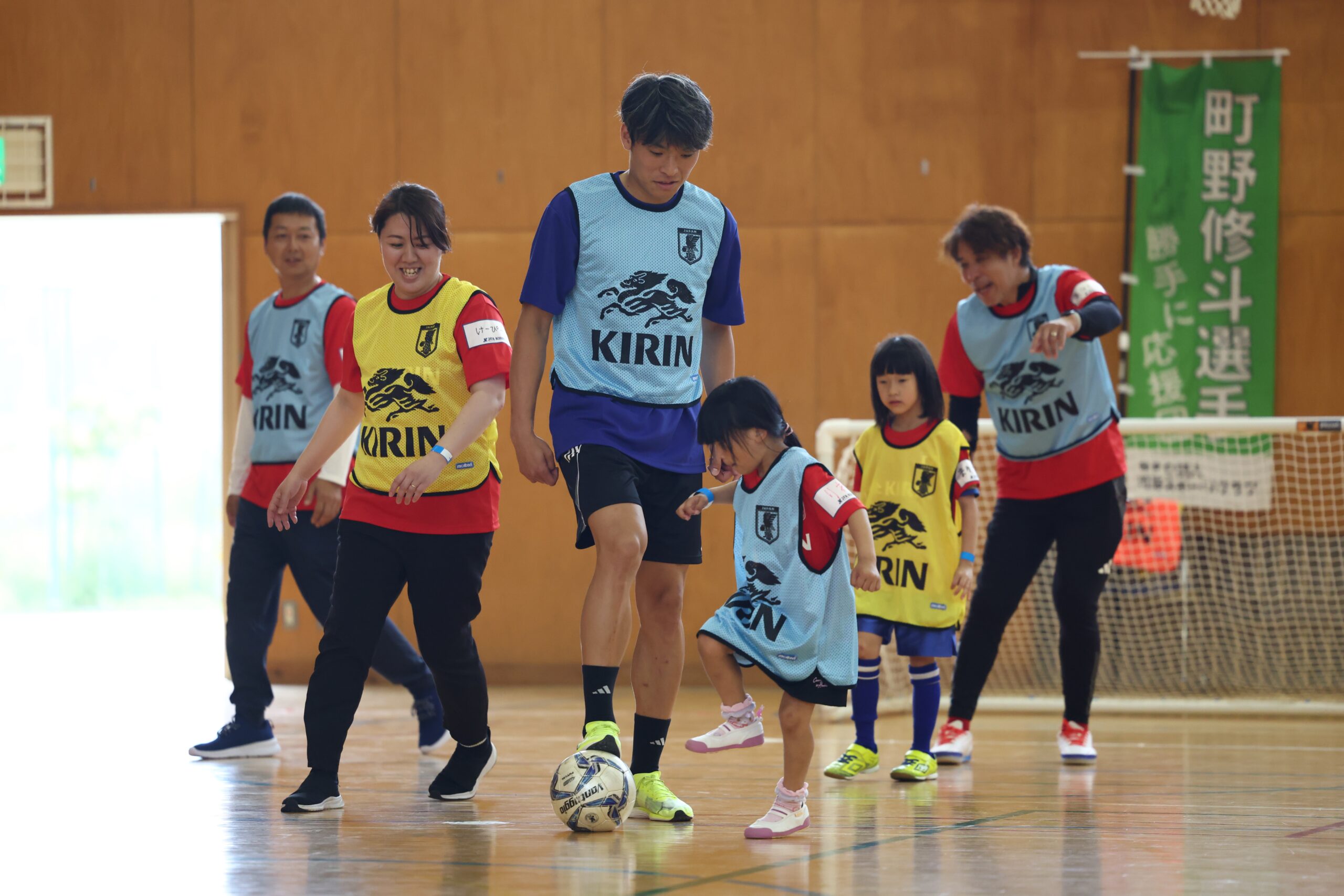 キリンホールディングス株式会社(社長 COO 南方健志、以下キリン)と、公益財団法人日本サッカー協会(会長 宮本恒靖、以下JFA)は共同で、2024年1月1日に発生した能登半島地震の復興応援プロジェクト「JFA・キリン ビッグスマイルフィールド」を昨年5月から継続して実施してきました。今回はその第7回目として「JFA・キリン ビッグスマイルフィールド in輪島市町野地区」を6月14日(土)に石川県輪島市立東陽中学校にて開催しました。開催地域の輪島市町野地区では、サッカー日本代表の町野修斗選手と地区の名前が同じというご縁から、兼ねてより地区をあげて町野選手の応援に取り組んでいます。その熱がこもった応援は町野選手ご本人にも届いており、この度初めて町野選手がサプライズでの現地訪問が実現しました。当日は元サッカー日本代表の永島昭浩さん、中西永輔さんもゲストとして登場し、老若男女で楽しめる “歩いて行うサッカー“ウォーキングフットボールや交流会を通して、被災地に笑顔を届けました。町野選手をずっと応援されていた、町野地区から参加の50代の女性は満面の笑顔で「応援していた町野選手に来場いただけるなんてびっくりでした。本当に嬉しかったです!」といった感想や、小学1年生の女の子は「おじいちゃんと一緒にできて楽しかったです。またやりたいです」など笑顔でお話しをいただきました。