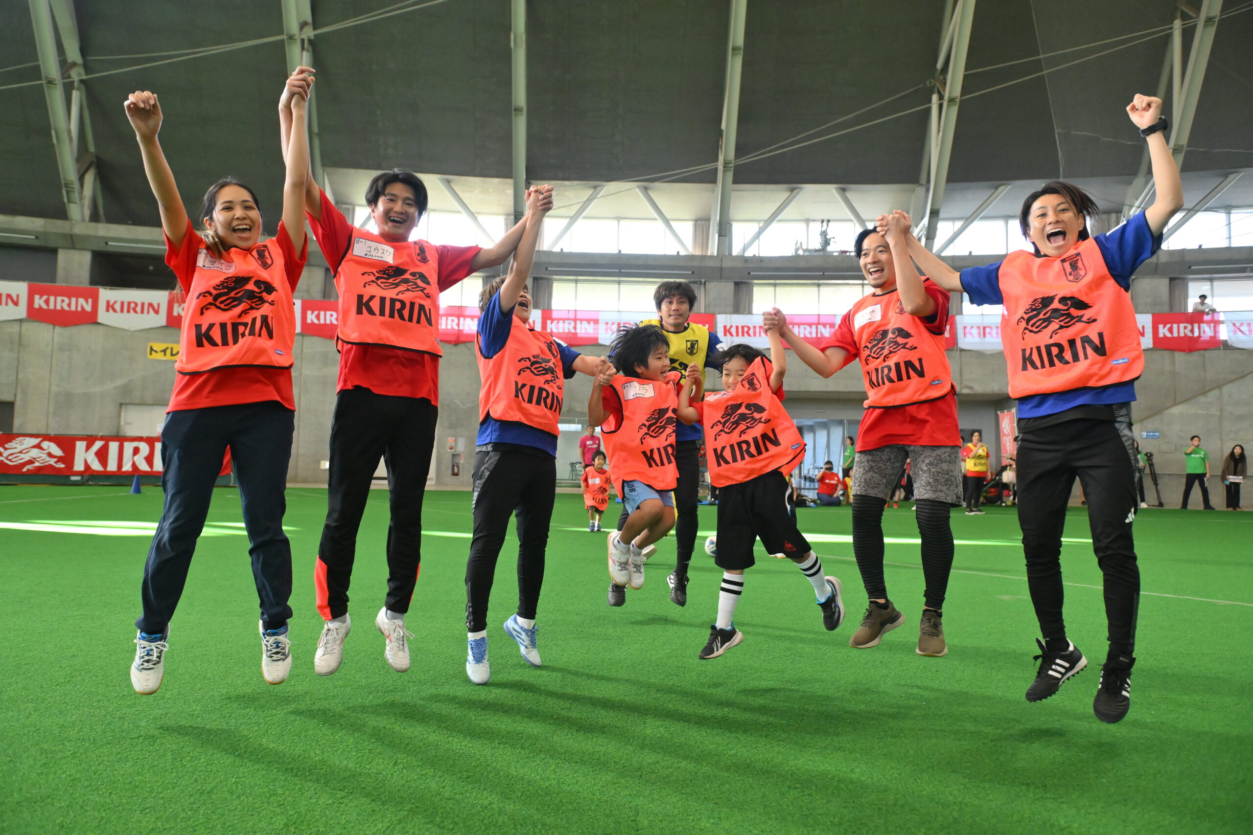 イベント当日は0歳〜90歳まで、合計292人の方に参加いただきました。開会式ではキリンHDの山田 雄一から「本日はご参加いただきありがとうございます。キリングループは1978年からサッカー日本代表を応援し、今年で48年目。キリンが長い間サッカーを応援してきたのは、サッカーには人と人を繋げる力があると信じてきたからです。今日はお子様だけじゃなく、普段お子様を応援しているお父さん、お母さん、おじいちゃん、おばあちゃんも一つのチームになり、ウォーキングフットボールを楽しみましょう!」といった挨拶でイベントがスタート。その後いよいよゲストとして、元サッカー日本代表 柏木陽介さん、安田理大さん、柿谷曜一朗さん、元なでしこジャパン近賀ゆかりさんと宮間あやさんが登場すると、会場は大盛り上がり!柿谷さんから「今日は皆さんとウォーキングフットボールを出来ることを楽しみにしていました。みんなで楽しくサッカーをしましょう!」といったコメントをいただき、また、安田さんからは、「今日活躍して、ウォーキングフットボールの日本代表を目指しています!ウォーキングフットボールで海外遠征に行くメンバーを探すので、みんなの良いプレーを期待していますよ!」といった冗談で会場を盛り上げました。