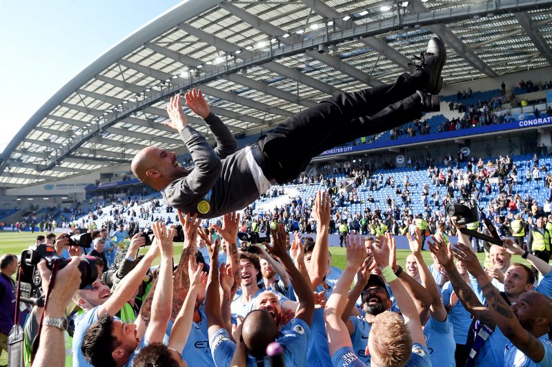 優勝が決まり胴上げされるグアルディオラ監督 [写真]=Getty Images